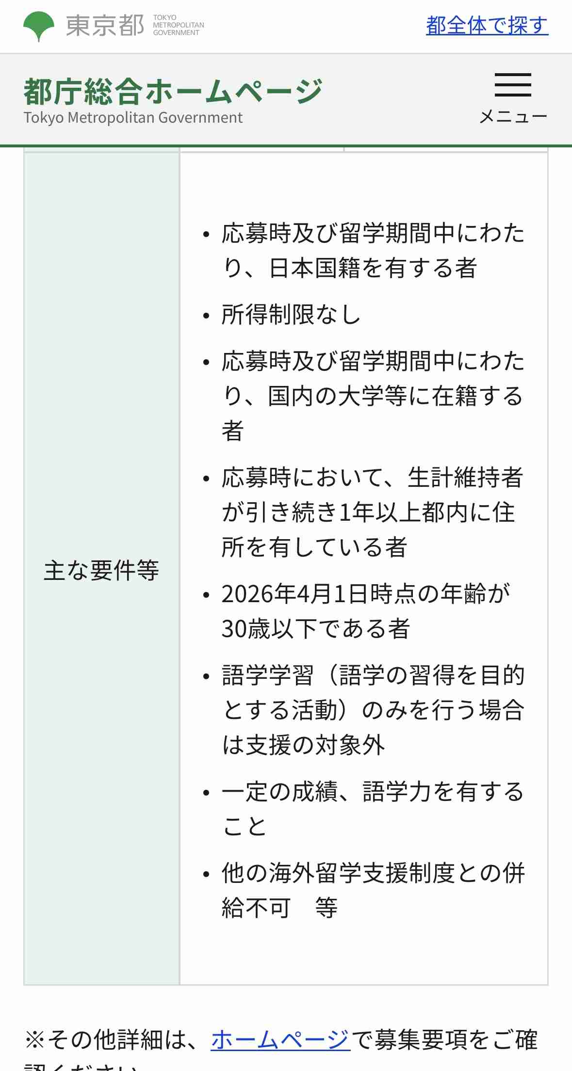 >>1返信大学生等の海外留学費用支援「東京グローバル・パスポート」|9月|都庁総合ホームページwww.metro.tokyo.lg.jp東京都では、東京と日本の新たな未来を創造するグローバル人材の育成に向け、新たに都独自の海外留学支援制度「東京グローバル・パスポート」を創設しました。海外留学の費用を支援することで、より多くの大学生等が海外留学の最初の一歩を踏み出すきっかけ作りをサ...