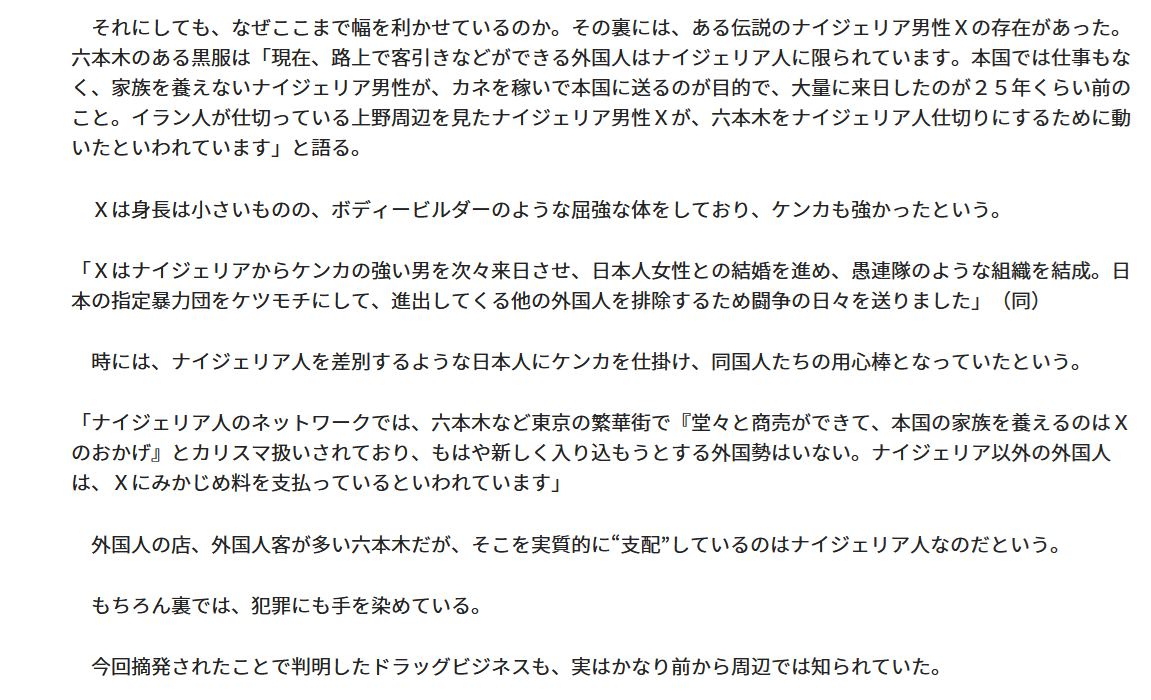 六本木「ナイジェリア人支配」のウラ 薬物販売バー摘発で4人逮捕 なぜ増殖?経緯を追うgirlschannel.net六本木「ナイジェリア人支配」のウラ 薬物販売バー摘発で4人逮捕 なぜ増殖?経緯を追う それにしても、なぜここまで幅を利かせているのか。その裏には、ある伝説のナイジェリア男性Xの存在があった。六本木のある黒服は「現在、路上で客引きなどができる外国人...