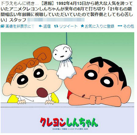 1992年から放映開始されている長寿人気アニメ「クレヨンしんちゃん」が終了するというデマが拡散している。内容によると「21年もの期間幅広い年齢層に視聴していただいていたので製作側としても心苦しい」ということだが「いいとも」終了が発表された後ということもあり、信じるユーザが多い。問題のツイートは『【速報】1992年4月13日から絶大な人気を誇っていたアニメクレヨンしんちゃんが来年の8月で打ち切り「21年もの期間幅広い年齢層に視聴していただいていたので製作側としても心苦しい」スタッフ』という内容で拡散している。