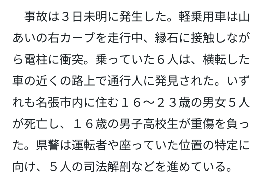 確かにそう。横転しながら電柱に激突して屋根をもぎ取られてるから、たとえシートベルトをしていたとしても同じくらい犠牲者が出たと思う。+6