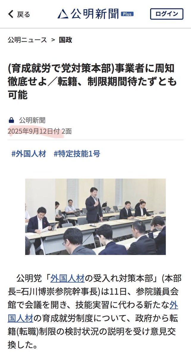 無期限就労が可能で家族が帯同可能な特定技能2号を取り易くさせる「育成就労制度」を事業者に今から周知徹底せよと公明党の「外国人材の受入れ対策本部」が騒いでいます。2025年9月12日付