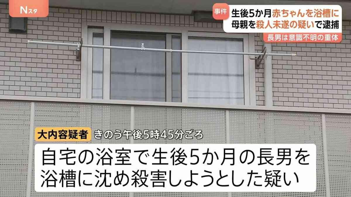 埼玉県の自宅で生後5か月の長男を浴槽に沈め殺害しようとしたとして、41歳の母親が逮捕されました。長男は意識不明の重体となっています。 殺人未遂の疑いで逮捕されたのは、埼玉県上尾市に住む大内路子容疑者(41)で、きのう午後5時45分ごろ、自宅の浴室で生後5か月の長男を浴槽に沈め殺害しようとした疑いがもたれています。