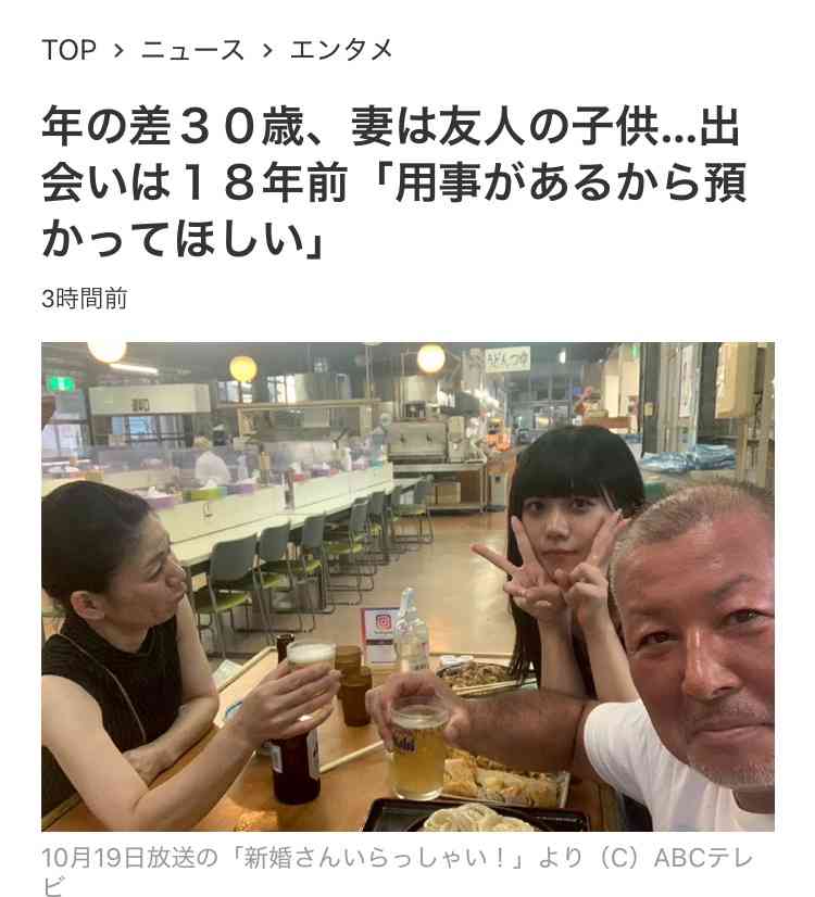 『新婚さん』30歳差の夫妻、夫35歳と妻5歳で出会い 妻の母は結婚猛反対→強行突破で婚姻届提出 | オリコンニュース(ORICON NEWS)www.oricon.co.jpお笑い芸人・藤井隆、タレント・井上咲楽が司会を務める、ABCテレビ・テレビ朝日系『新婚さんいらっしゃい!』(毎週日曜 後0:55)の19日放送回に、「30歳違いの歳の差カップル」が登場する。