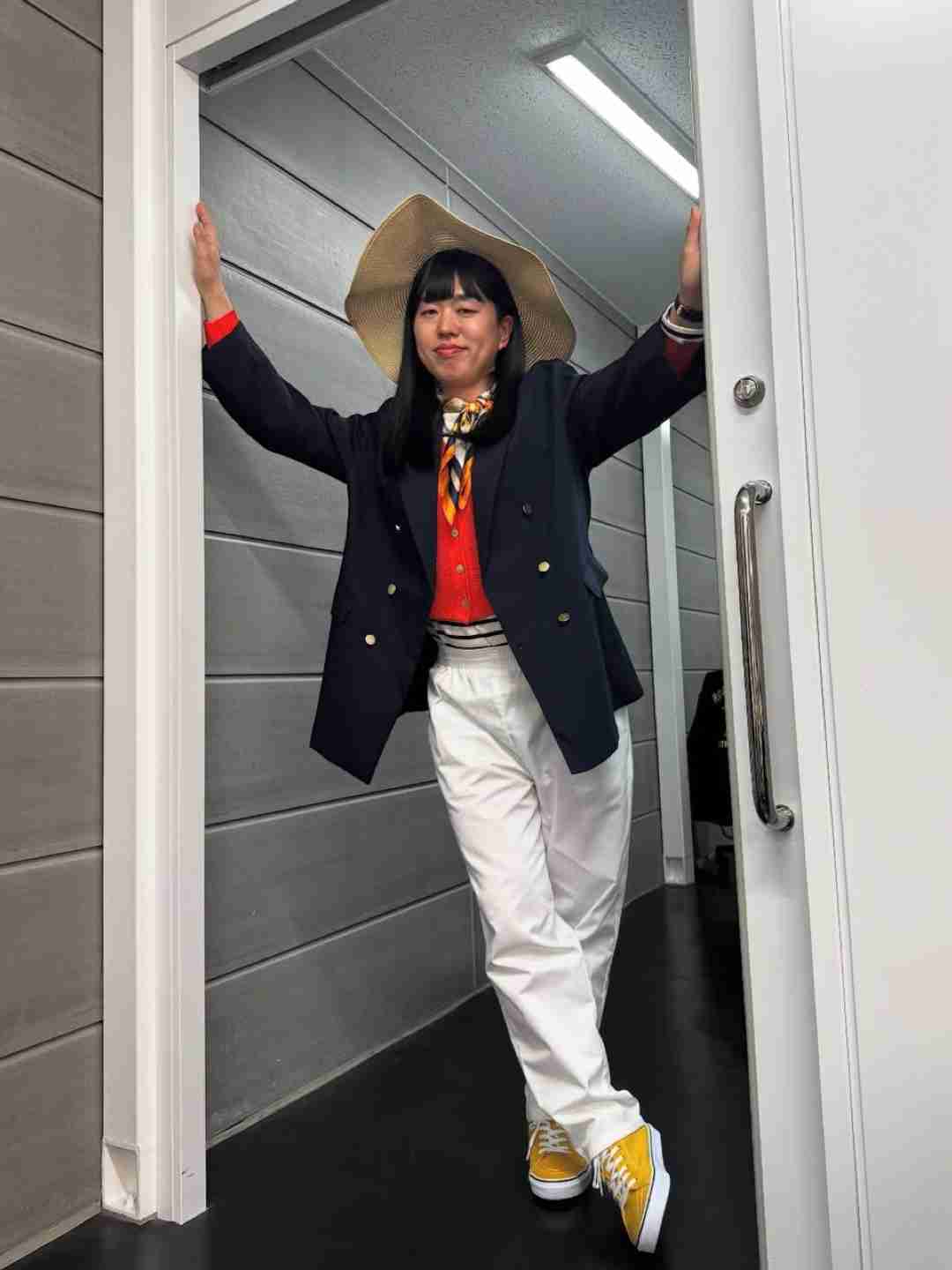 低身長は、視線が上にいくように、上半身は小物類で盛って、ボトムとシューズは色を繋げてシンプルにすると良いと思います。