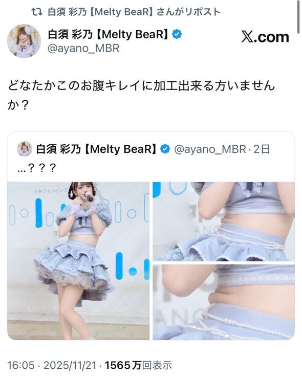 加工なんて誤魔化はいらないのよ返信![“ハミ肉”公開アイドルがインプ1680万超えバズ・Melty BeaR白須彩乃の投稿が話題]()