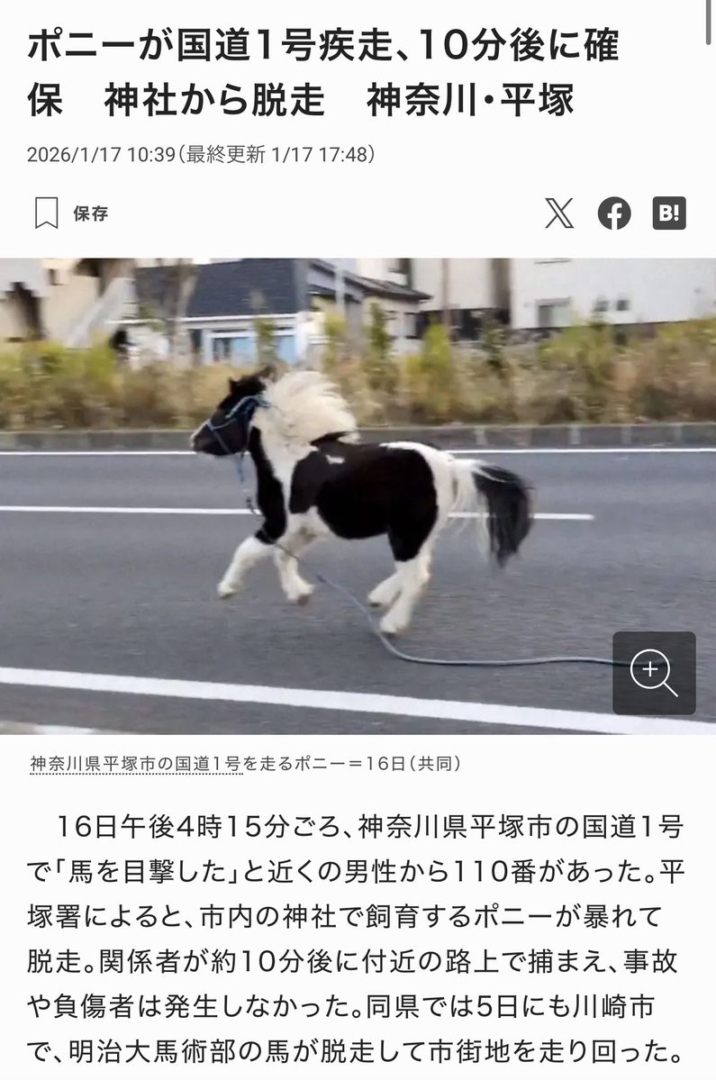 平塚で脱走のポニー、性格は「のんびりマイペース」 名前は「東風」 | 毎日新聞mainichi.jp16日午後4時15分ごろ、神奈川県平塚市の国道1号で「馬を目撃した」と近くの男性から110番があった。県警平塚署によると、平塚八幡宮で「神馬(しんめ)」として飼育している3歳の雄のポニー「東風(こち)」が、小屋に戻る際に暴れて脱走したという。約10分後に八幡宮の職員が260メートル先の路上で捕まえた。