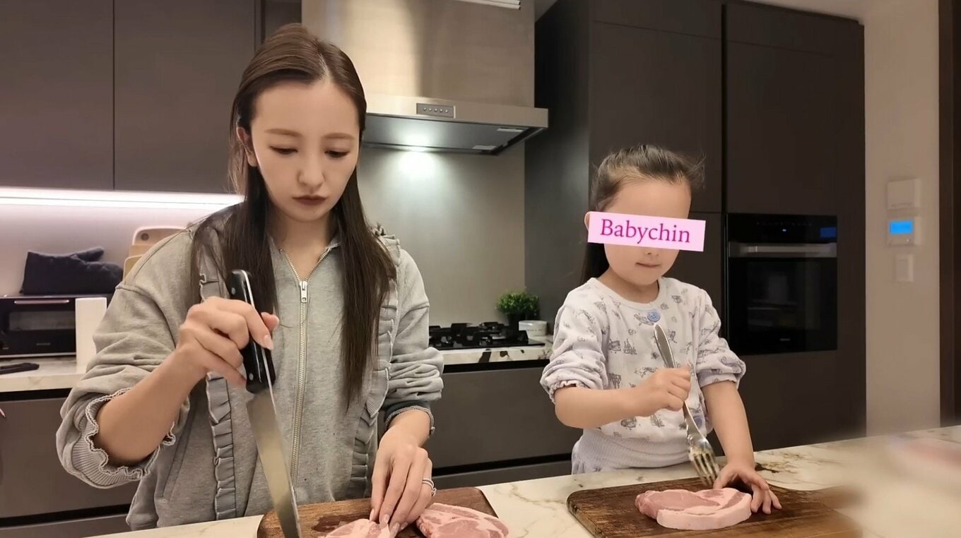 その後、板野さんは娘のベビちんとともに電動自転車でスーパーへ買い出しへ。帰宅後は疲れてうとうとしながらも洗濯物をたたみ、夜ご飯の支度に取りかかります。この日のメニューはチャプチェ、マーボーナス風のナスとオクラのネバネバ炒め、エリンギとえのきのバター炒め、アボカドサーモンなど、バラエティ豊かな品揃えでした。