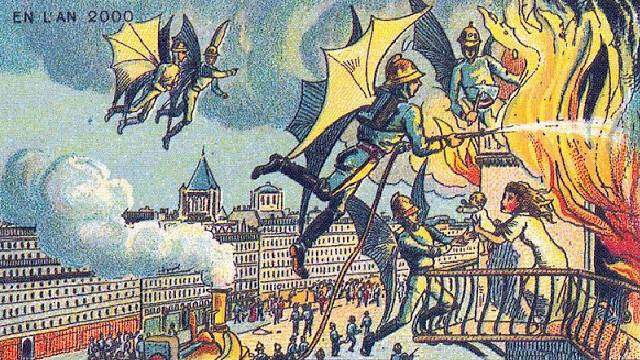 1900年に開催された「パリ万国博覧会」のために最初のシリーズが描かれ、後に87種類まで描かれたという、「100年後の未来」を想像して描いたイラストより