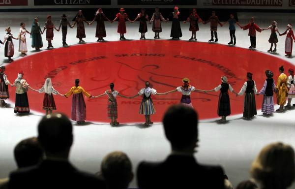 プーチン大統領が日本への連帯感をしめす為に、白いリンクに赤い丸で「日の丸」をあらわすという演出演をしてくれたそうだ。周りを囲むのは各国の民俗衣装を着たスケーター達。