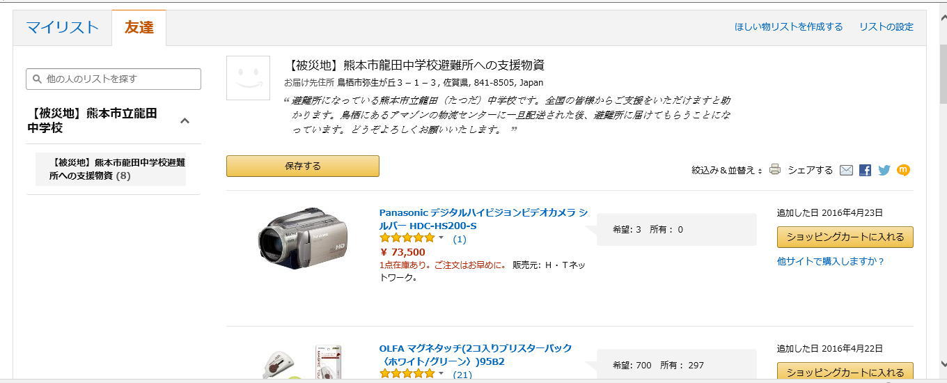 熊本市龍田中学校がアマゾンほしい物リストで600万円分をおねだりして炎上 一眼レフカメラやビデオカメラなど | ゴゴ通信gogotsu.comアマゾンで熊本地震で被害に遭われた方のほしい物リストが公開されている。これはアマゾンジャパンが被災地を支援するための措置としてほしい物リストを活用して今足りない物を届けて貰おうというもの。「ほしい物リスト」とはアマゾンのシステムで、貰う側は金銭の負担は無く送る側が支払い相手にプレゼントすることが出来るシステム。貰う方は送り先も開示する必要なく、「ほしい物リスト」を介してアマゾンが発送を行う。