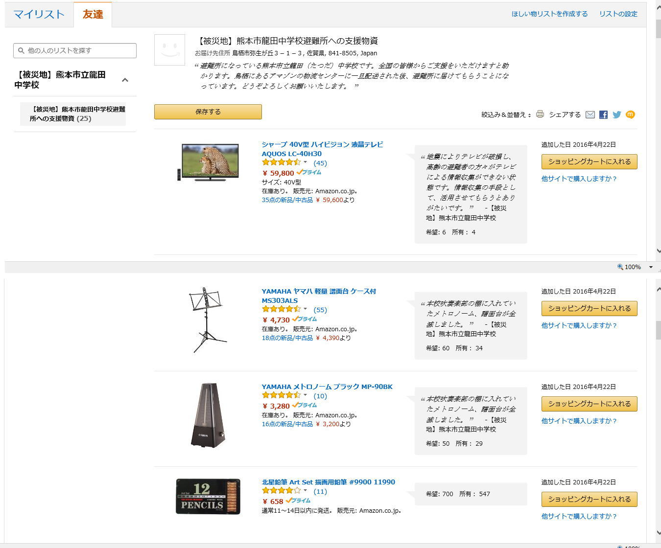 熊本市龍田中学校PTAのFacebookでは「デジタルカメラ、デジタルビデオなど高価な支援物資も入っております。あくまでほしいというだけですので、ご支援頂けるか頂けないかは購入して頂けるみなさまにお任せするしかありません」と書かれている。