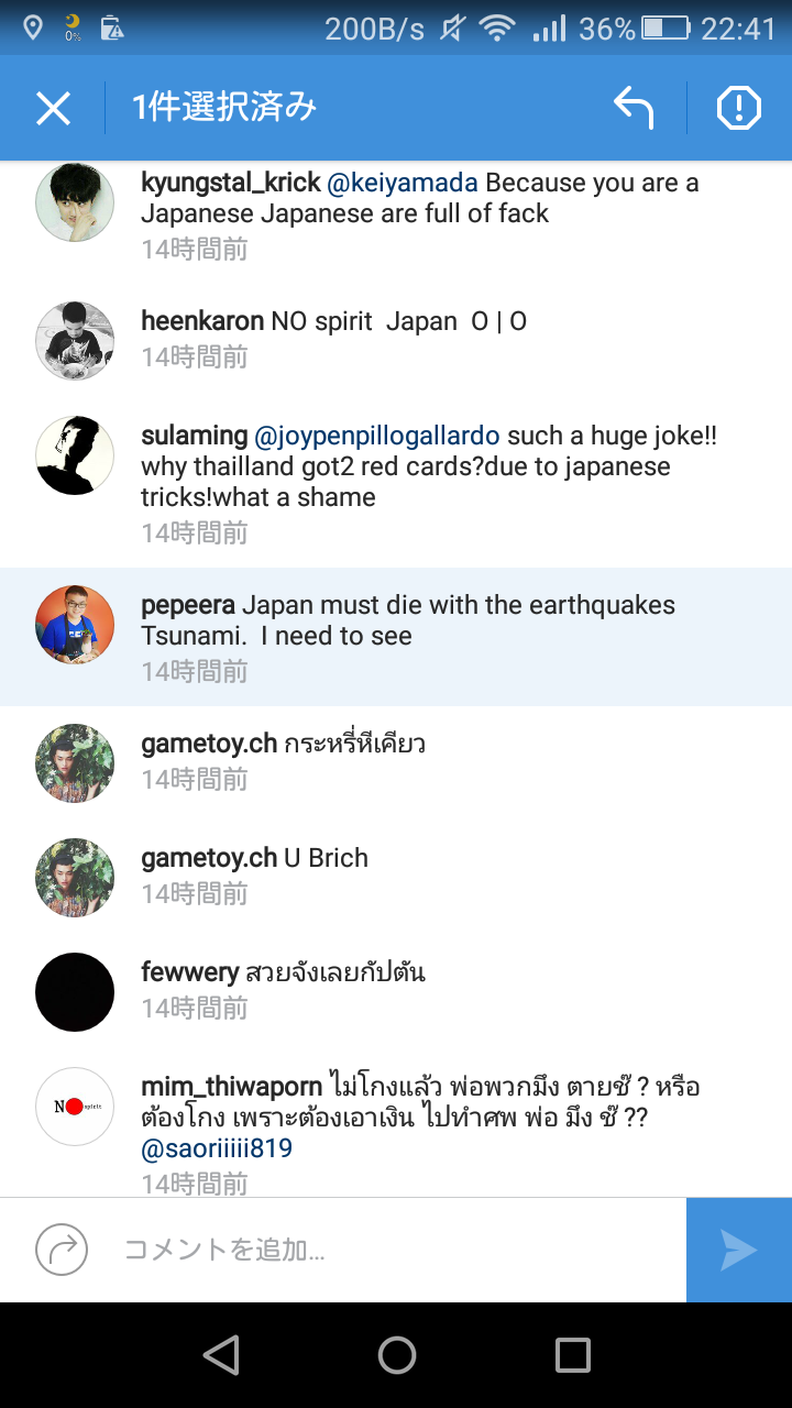 木村沙織のInstagramのコメントに、「日本は地震と津波で死ぬべき。」みたいなことを書いているヤツが居た。いくらなんでもこんなことを言えるなんて同じ人間とは思えない。酷すぎる。+36