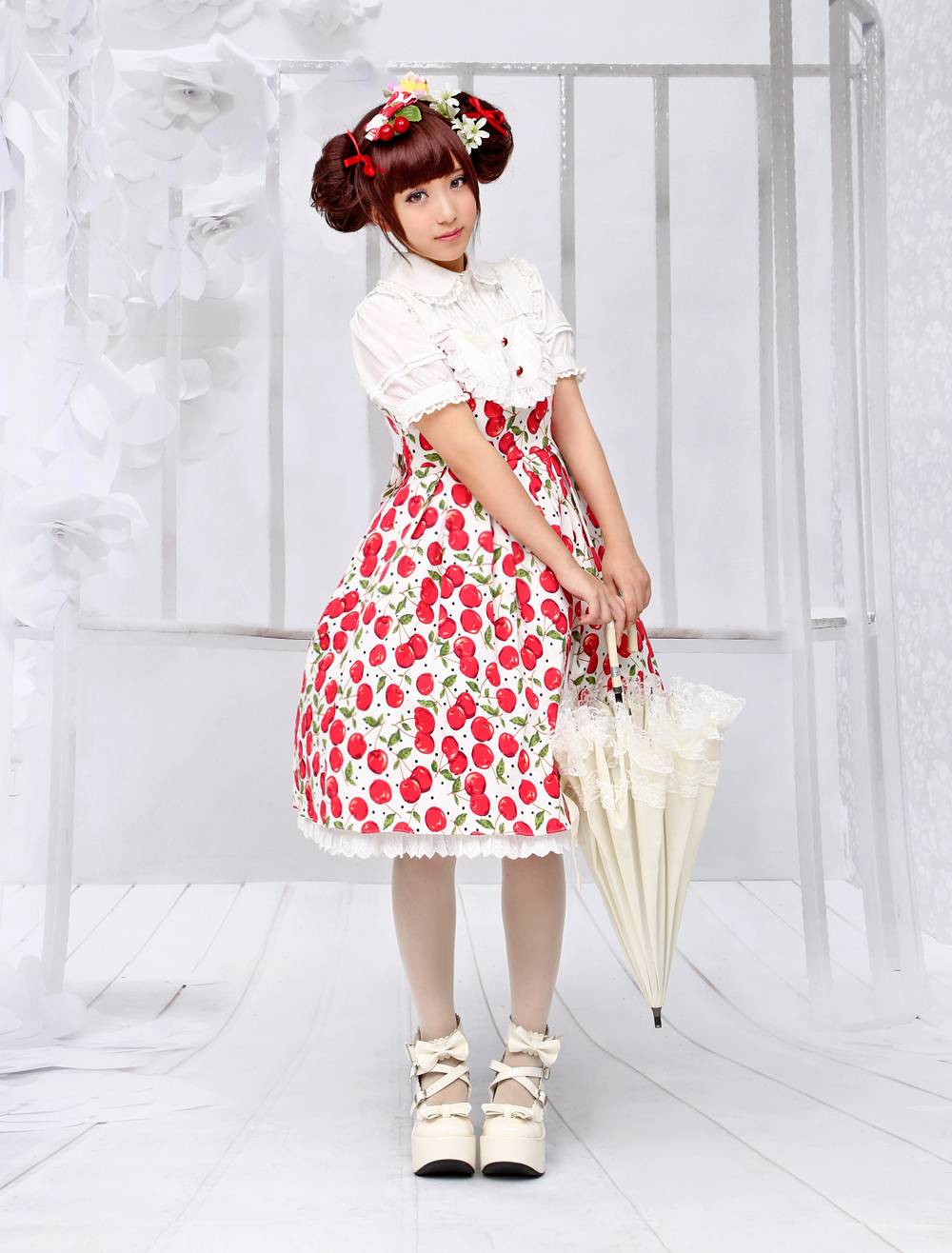また全面に散りばめられている「チェリー柄」については、「これは私が大好きなモチーフで、結果的にオリジナルの生地から作っていただきました。さりげなくX21の文字もデザインに入れこんであります」と語った。+48