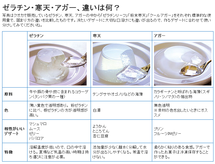 どっちも好きだけど一番すきなのは「アガー」ゼラチンのぷるぷると寒天の固まったら溶けない部分のいいとこ取りの素材よ!