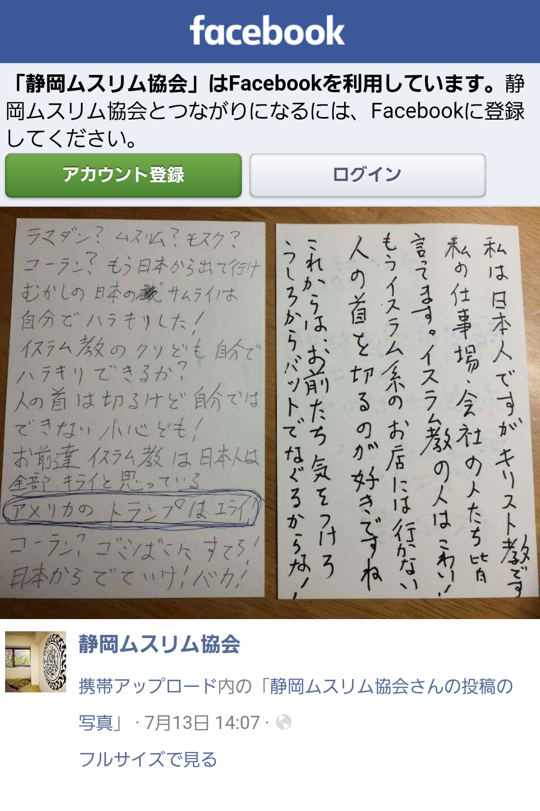ハガキの内容はよくないんだけど、自分たちの仲間(イスラム教の人々)がしてることを考えたら、