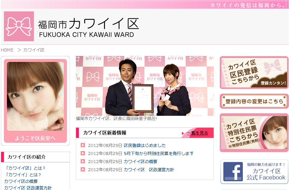 AKB48篠田麻里子が区長を務める福岡カワイイ区に苦情が殺到!?girlschannel.netAKB48篠田麻里子が区長を務める福岡カワイイ区に苦情が殺到!? 福岡市が新設した仮想行政区「カワイイ区」に対し、市民から「『女性はかわいくなければ』というメッセージを発信している」との苦情が相次ぎ、市の男女共同参画審議会(会長・藤井千佐子福岡大非常...