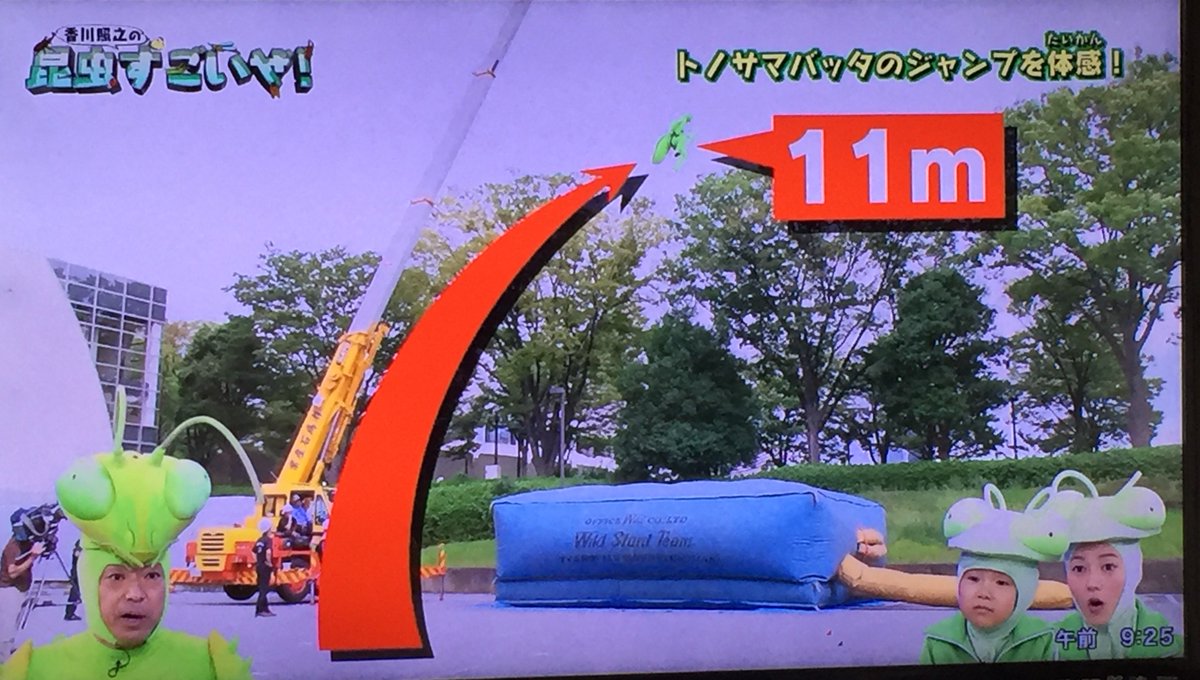 スタジオでは番組MCとして“メスのカマキリ”の全身着ぐるみを着た香川が登場、寺田心くん(8歳)と山内芹那(21歳)に、いかに昆虫は素晴らしいのか、トノサマバッタを例にしながら講義が進められた。