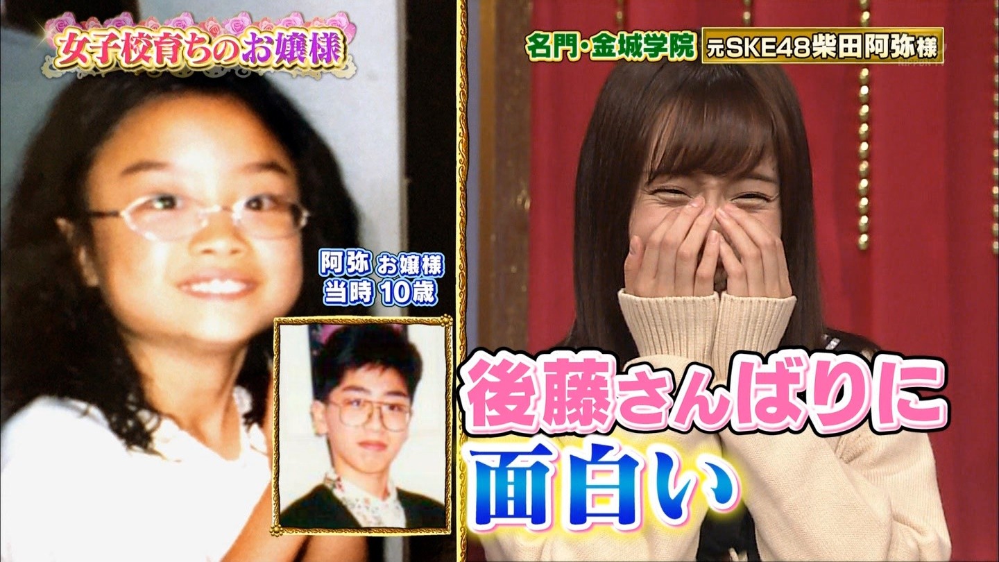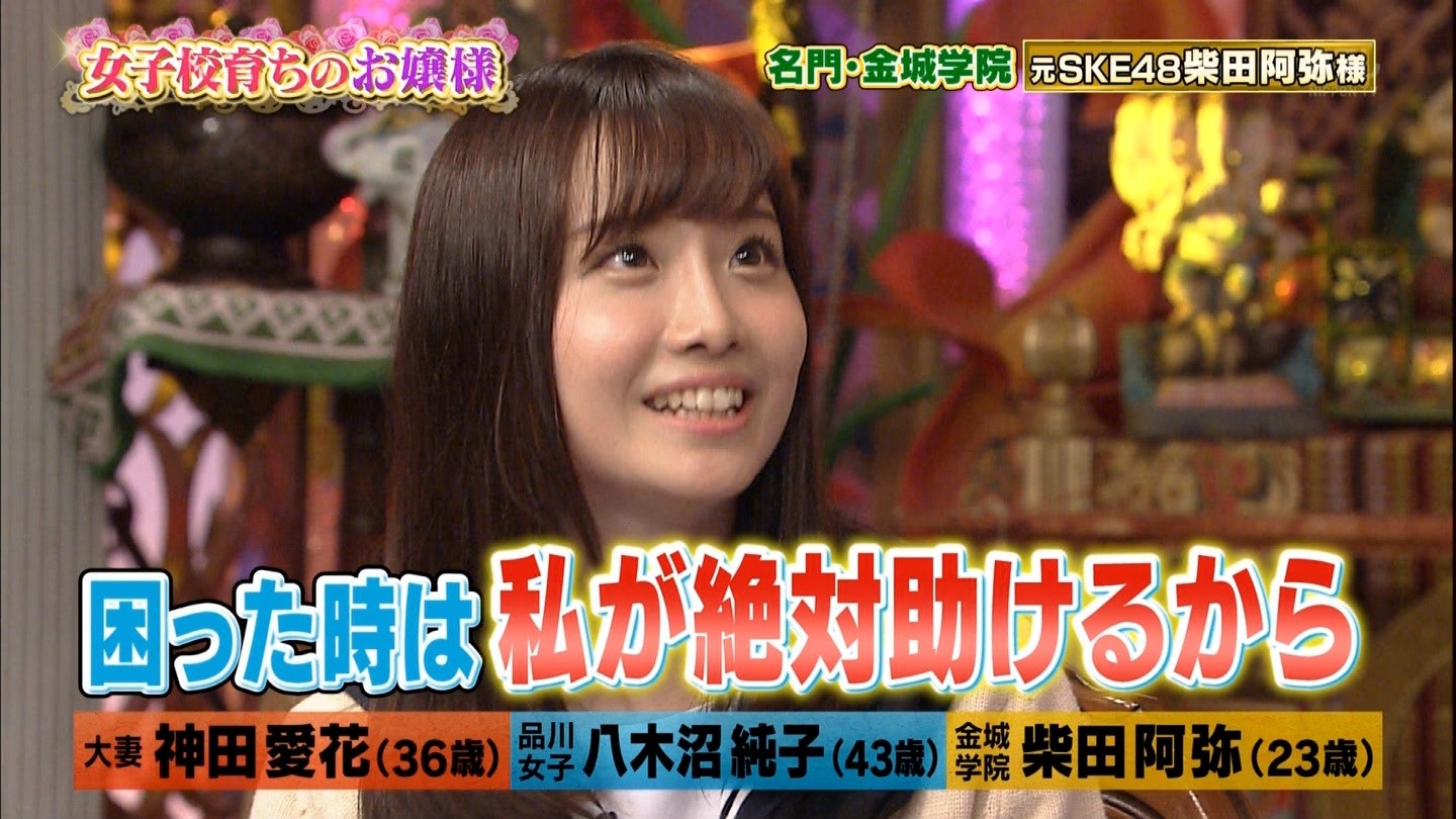 元SKE48柴田阿弥の"絶対に性格が悪い女の特徴"にスタジオ大共感|ニュース&エンタメ情報『Yomerumo』news.merumo.ne.jp毎週火曜深夜、フットボールアワーの後藤輝基、チュートリアルの徳井義実、HKT48の指原莉乃が様々なゲストを招いて、ゲストのプライベートや秘密に迫るバラエティー番組「今夜くらべてみました」(日本テレビ系)。 10月18日の放送テーマは「女子高育ちのお嬢様」。 ゲストにフリーアナウンサーの神田愛花、プロスケーターの八木沼純子、そしてSKE48卒業後にフリーアナウンサーへと転身した柴田阿弥が出演した。 ゲストの1人である柴田は、フリーアナウンサーとして芸能活動をする一方で、大学にも通っている。そして女子校育ちのお嬢様であることを告白した。 通っていたのはお嬢様学校ということで